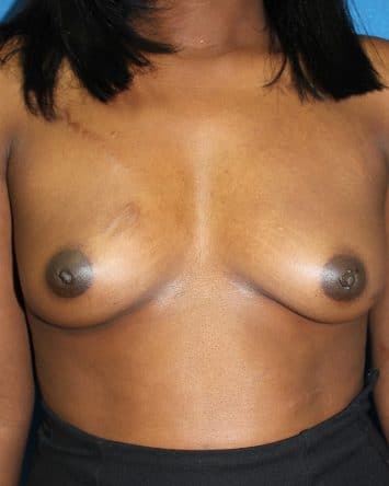 This is a 36 year-old female who presented desiring breast augmentation. She wore a 34B cup bra and desired to be a small D cup postoperatively. She underwent breast augmentation with Mentor smooth round high profile saline implants, size 420cc filled to 450cc. The implants were placed under the muscle through 3cm inframammary fold incisions.